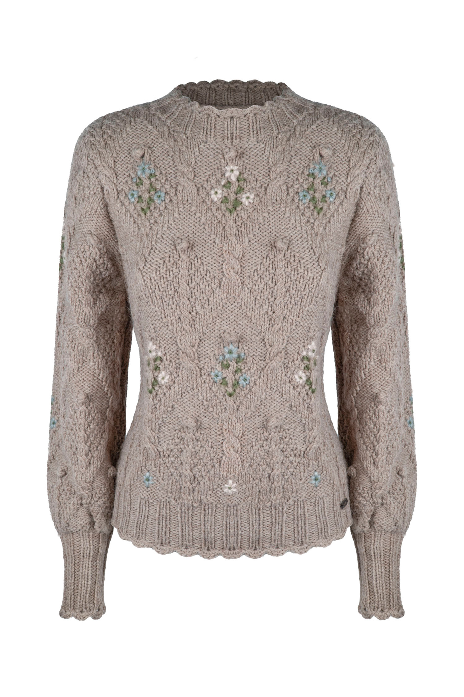 Pullover handgestrickt aus 70% Merino, 30% Alpaka. Der Pullover aus weichem und angenehmen Garn besticht mit einem aufwändigen Strickmuster. Durch die Stickerei auf Vorder-, Rückteil und den Ärmeln wird dieser Pullover zu einem Unikat.