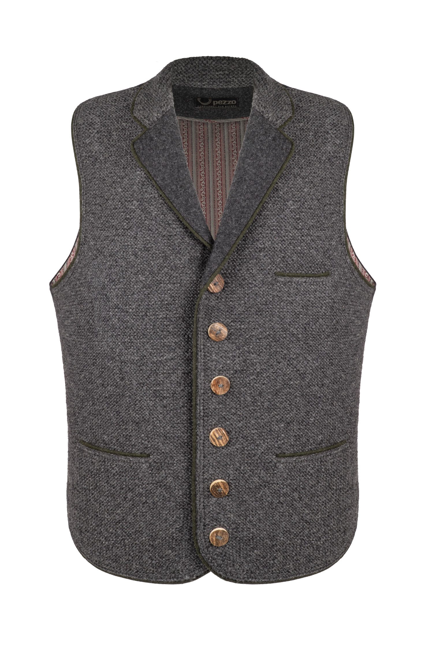 Die Weste zeichnet sich durch die stilvolle Front mit schönem Strickmuster aus, während die Rückseite mit hochwertigem Loden besticht. Eine traditionelle Note bekommt die Weste durch die Rinderhornknöpfe.
